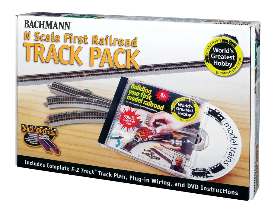 It’s never been easier to get started in model railroading! Our World’s Greatest Hobby® First Railroad Track Pack contains all the track you need to build a 56″ x 28″ N scale track layout. Also included is a copy of the DVD, Building Your First Model Railroad. Hosted by actor and model railroad enthusiast Michael Gross, this video features the construction of an HO model railroad with hints and tips that apply to every scale. Get on track for fun with the Word’s Greatest Hobby!