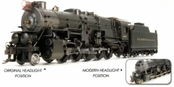 In 1916, the Pennsy railroad developed a new, supersized 2-10-0 steam engine that was powerful enough to move the tremendous amounts of coal and ore being moved on the system. Initial tests were impressive, and between 1918 and 1923, the PRR built 598 Class I1s Decapods. They were the largest 2-10-0 steam locomotives in the United States, and they became the dominant freight locomotives on the PRR railroad system until World War II. Sometimes called “hippos”, the I1s’s were huge. Unfortunately, the large boiler size limited the amount of space for large driving wheels, and the result was a hard ride and hard work for crews. Their power was undeniable, and they remained in service until the end of PRR steam in 1957. BLI’s model is of the sub-class I1sa locomotives. With the conversion to I1sa, Pennsy increased the maximum steam cut-off, boosting low speed tractive effort. 489 of the hippos were eventually converted.
