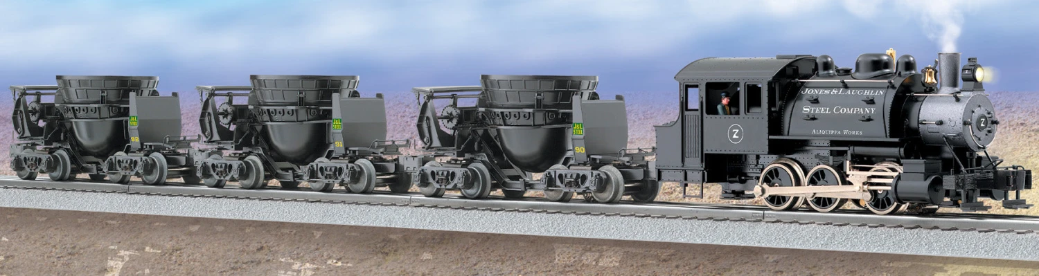 Leaving a plume of smoke and signaling with a melodious “hoot!” from its whistle, the workhorse dockside switcher signals its approach hauling a red-hot cargo straight from the blast furnace. This all-new set offers a classic unit train from the steel industry. Both the cars and the locomotive are marked with logos of the famous western Pennsylvania steel company, Jones & Laughlin, once one of the largest in the U.S. Both the locomotive and cars are built almost entirely of die-cast metal. Each car even includes a realistic, flickering slag load.