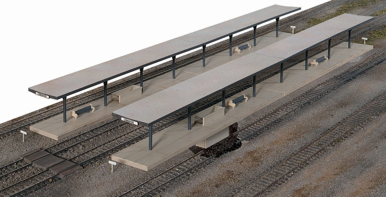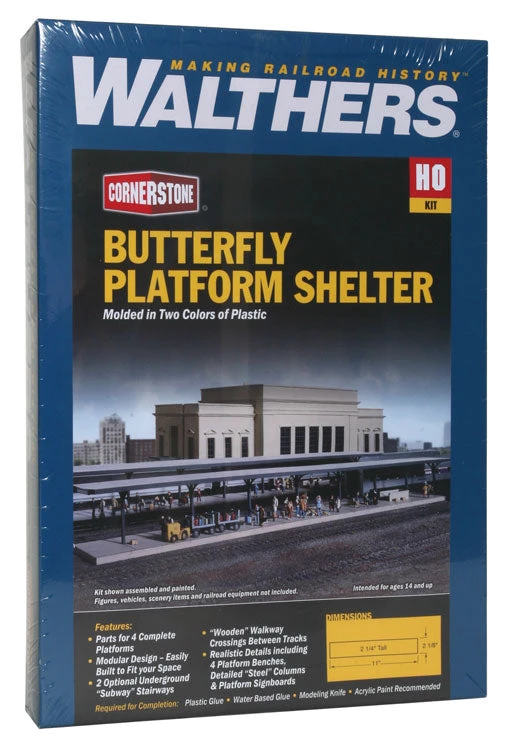 Building a detailed terminal scene for your passenger trains is easy with this kit. Based on the almost universal Butterfly design, platforms of this type can be found at stations in big cities and outlying suburbs where they have served passengers for many years. The kit includes parts for four complete platforms and features a modular design so you can combine multiple kits to make longer platforms. To get passengers to and from trains safely, a pair of optional underground subway stairway entrances are included to add realistic detail without a lot of work. Wooden walkway crossings between tracks, platform benches, detailed steel columns, platform signboards and realistic details are all included. Ideal for use with any steam, transition or diesel-era layout, these train depot platform shelters look great alongside Cornerstone Union Station 933-3094, sold separately, and similar station facilities. The Butterfly-Style Station Platform Shelters kit is one of a wide variety of Cornerstone HO Scale railroad structures.